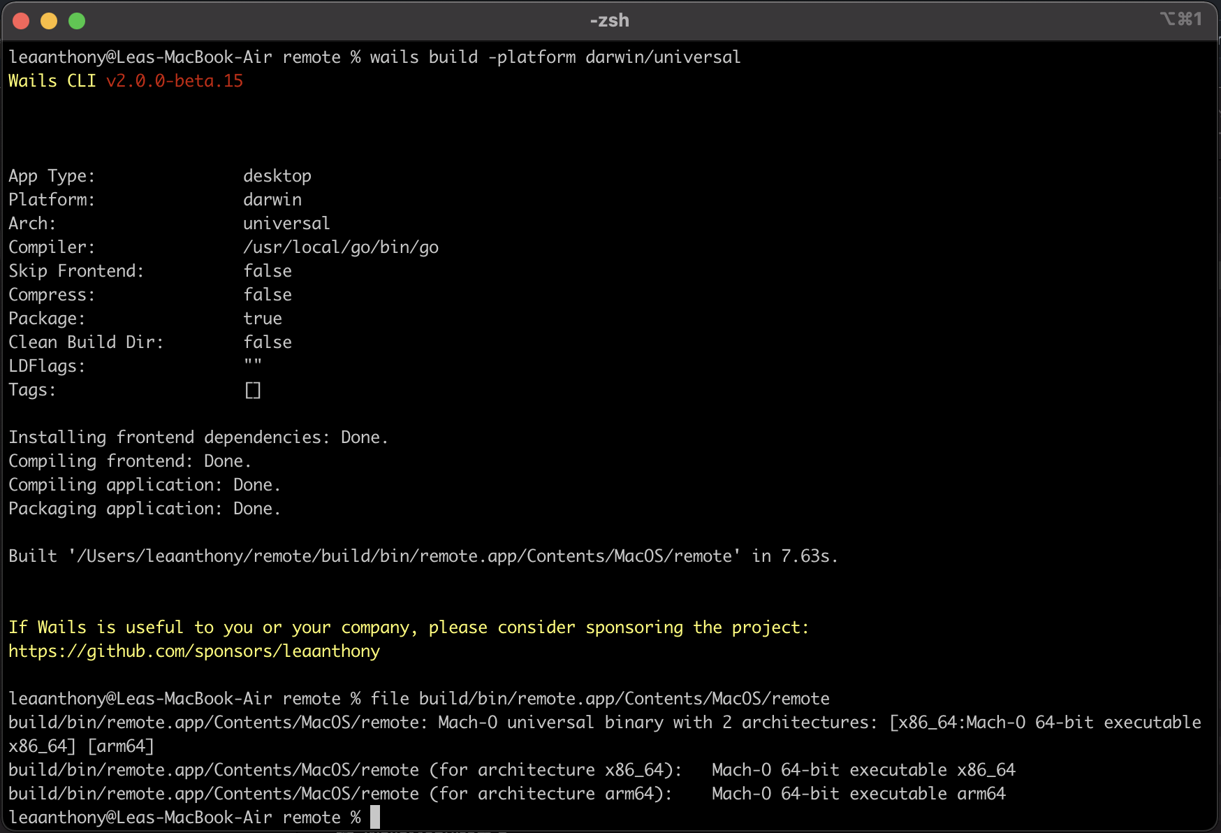 A peça que falta no quebra-cabeça da construção são as operações atómicas no processo de construção, como geração, compactação e empacotamento de ícones. Para exigir um monte de ferramentas externas não seria uma ótima experiência para o desenvolvedor. Para resolver isso, a CLI do Wails fornecerá todos esses recursos como parte da CLI. Isso significa que as compilações ainda funcionam como esperado, sem ferramenta externa extra, no entanto você pode substituir qualquer passo da compilação por qualquer ferramenta que você goste.